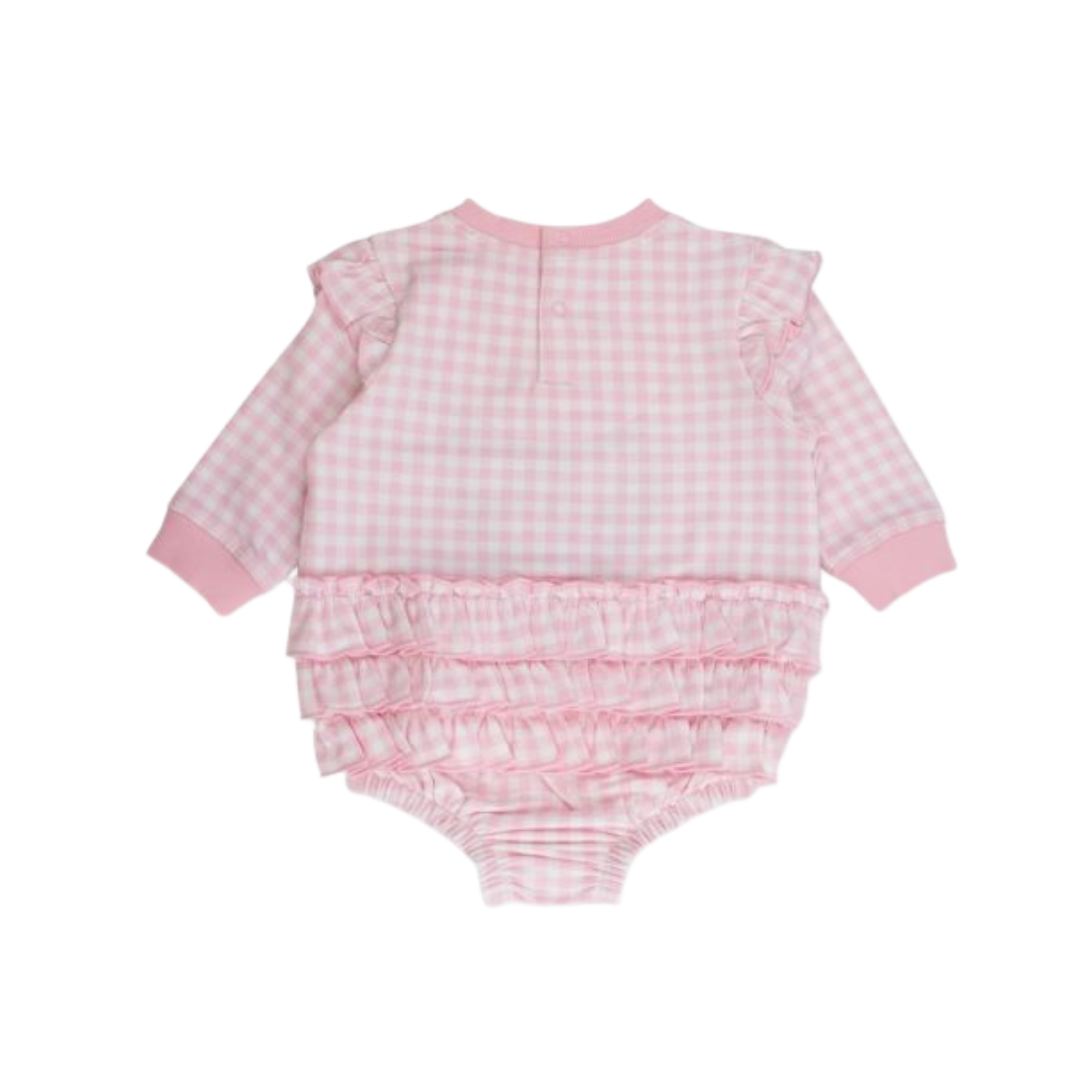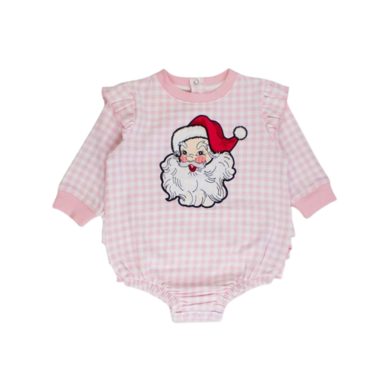 Dear Santa Pink Gingham Applique Sweatshirt Bubble Romper is the perfect holiday themed babywear for your little girl. Dressed in a charming pink gingham pattern, this girls pink romper features adorable Santa applique details that capture the festive spirit. Designed with your baby's comfort in mind, this soft knit baby romper ensures a snuggly fit with stretch fabric that allows for easy movement.