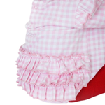 The romper boasts practical snaps for easy changing, making diaper changes swift and less disruptive. It also includes full seat coverage to ensure your infant stays comfortable throughout the day, and signature rear ruffles that add a touch of whimsy. The ruffle detail enhances the overall look, making it an attractive toddler gingham outfit for holiday photos and family gatherings.