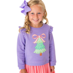 Purple Twinkling Tree Bow Applique Flutter Sweatshirt is the perfect addition to your little girl's wardrobe this winter season. Featuring a charming twinkling tree applique and an adorable bow, this purple girls' sweatshirt combines style with comfort. The flutter sleeves add a touch of elegance, making it an ideal choice for both casual and special occasions.