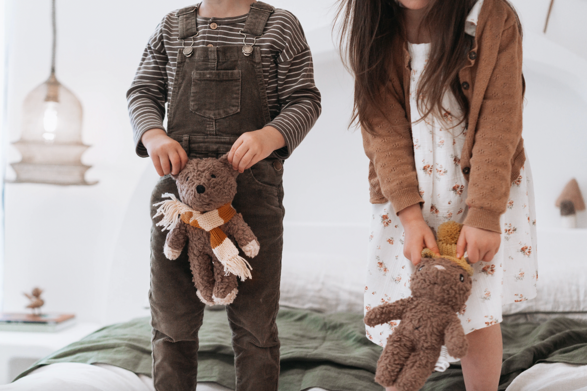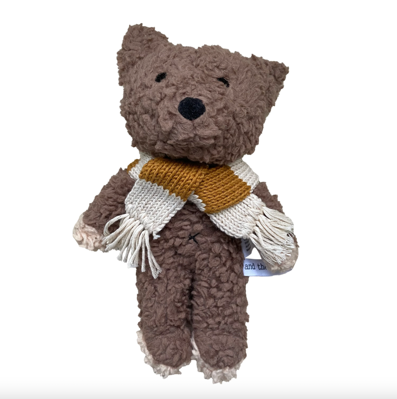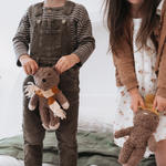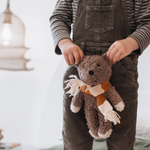 Elliot dog is made with our unique cotton plush fabric and sports a striped knitted Australian merino wool striped scarf. He loves hunting for treasure, toasting marshmallows and exploring in the woods.