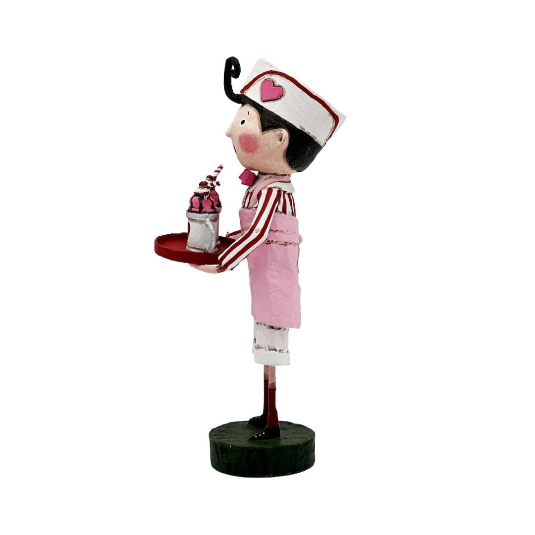 Serving up a large scoop of love, this server carries two desert mugs to a lovely couple on their Valentine's date. Wearing a pink apron with red striped shirt and matching soda jerk serving cap, he is busy tonight with the mad rush. Cast from Lori's original sculpted artwork, these figurines feature detailed carving, shaping, and painting!
