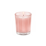 Pink-tinted wax housed in a glass vessel of the same color etched with elegant, frosted stripes.
