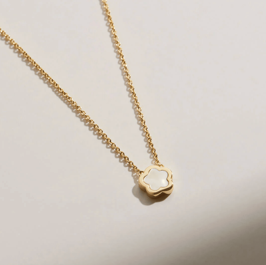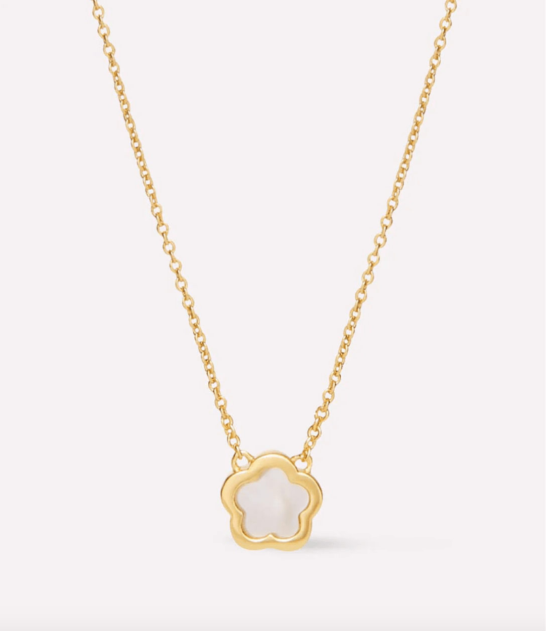 The lovely iridescence of this Mother-of-Pearl inlay flower pendant is complemented by the gleam of 14K gold over Sterling Silver. Five delicate rounded petals and a central Mother-of-Pearl inlay adorn this pendant, placed on a dainty oval cable chain. Pair this Mother-of-Pearl inlay flower pendant with the matching Rei earrings to achieve an effortlessly chic look.