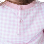Dear Santa Pink Gingham Applique Sweatshirt Bubble Romper is the perfect holiday themed babywear for your little girl. Dressed in a charming pink gingham pattern, this girls pink romper features adorable Santa applique details that capture the festive spirit. Designed with your baby's comfort in mind, this soft knit baby romper ensures a snuggly fit with stretch fabric that allows for easy movement.